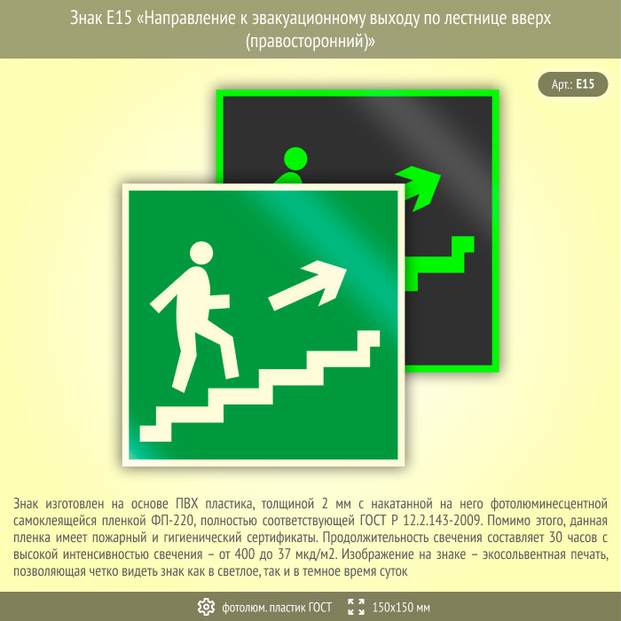 Знак E15 «Направление к эвакуационному выходу по лестнице вверх (правосторонний)» (фотолюминесцентный пластик ГОСТ 34428-2018, 150х150 мм) в Ачинске купить