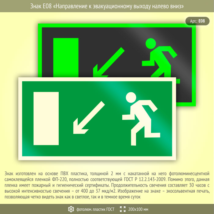Знак E08 «Направление к эвакуационному выходу налево вниз» (фотолюминесцентный пластик ГОСТ 34428-2018, 200х100 мм) в Ачинске купить