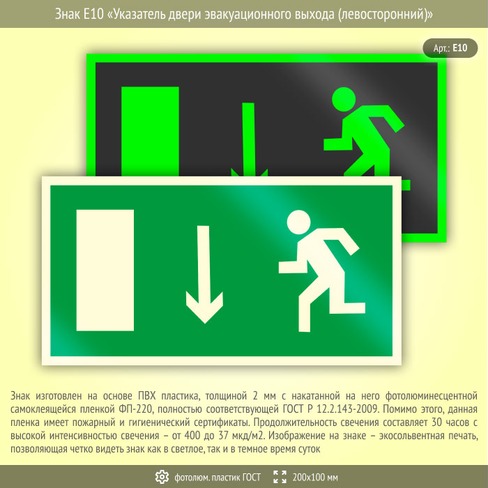 Знак E10 «Указатель двери эвакуационного выхода (левосторонний)» (фотолюминесцентный пластик ГОСТ 34428-2018, 200х100 мм) в Ачинске купить