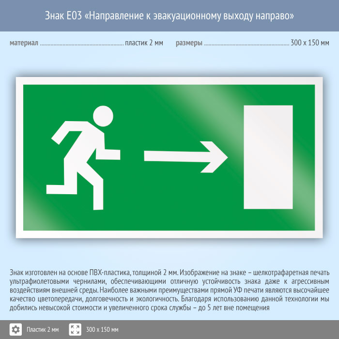 Знак E03 «Направление к эвакуационному выходу направо» (пластик, 300х150 мм) в Ачинске купить