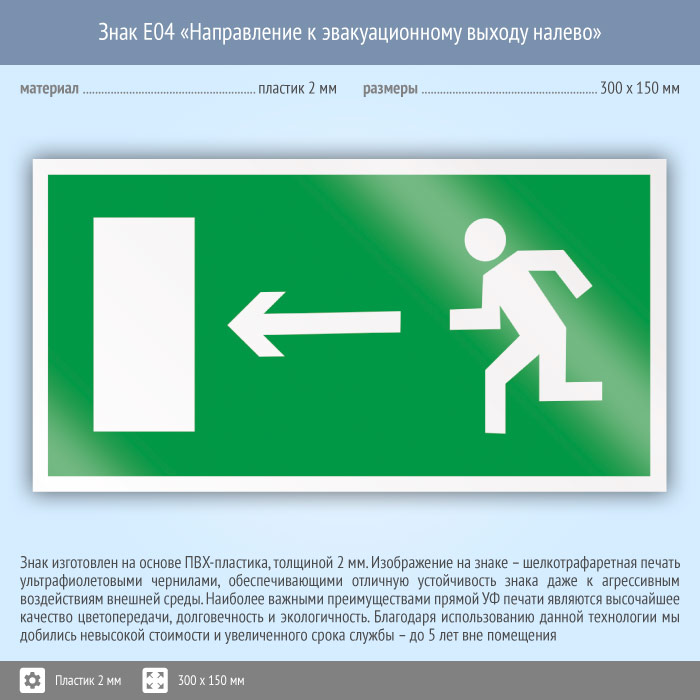 Знак E04 «Направление к эвакуационному выходу налево» (пластик, 300х150 мм) в Ачинске купить
