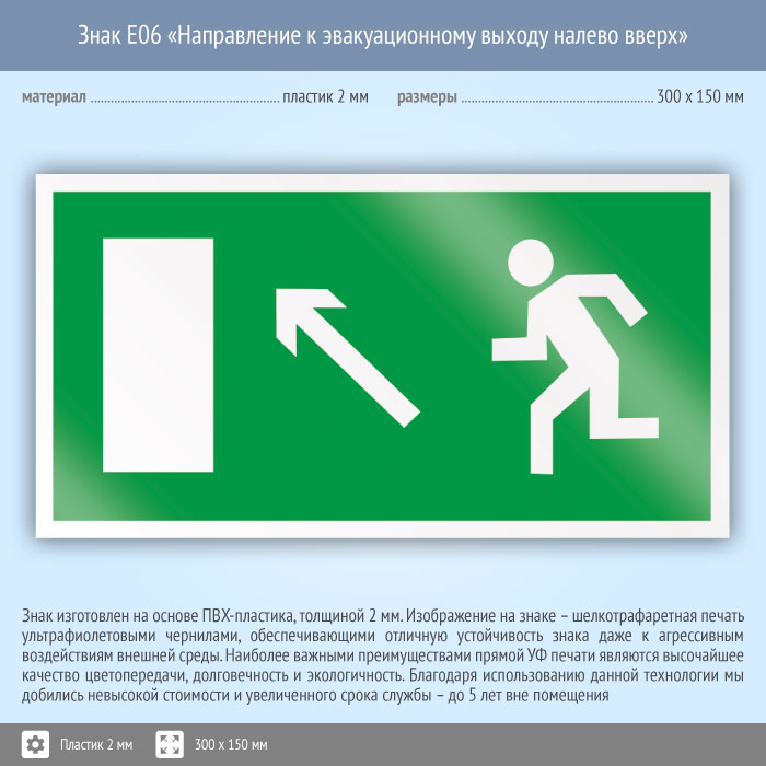 Знак E06 «Направление к эвакуационному выходу налево вверх» (пластик, 300х150 мм) в Ачинске купить