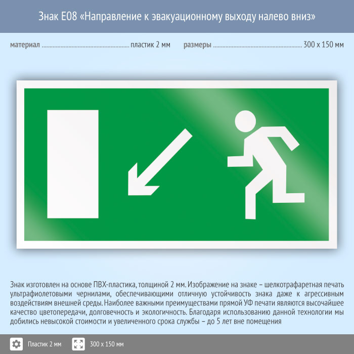 Знак E08 «Направление к эвакуационному выходу налево вниз» (пластик, 300х150 мм) в Ачинске купить