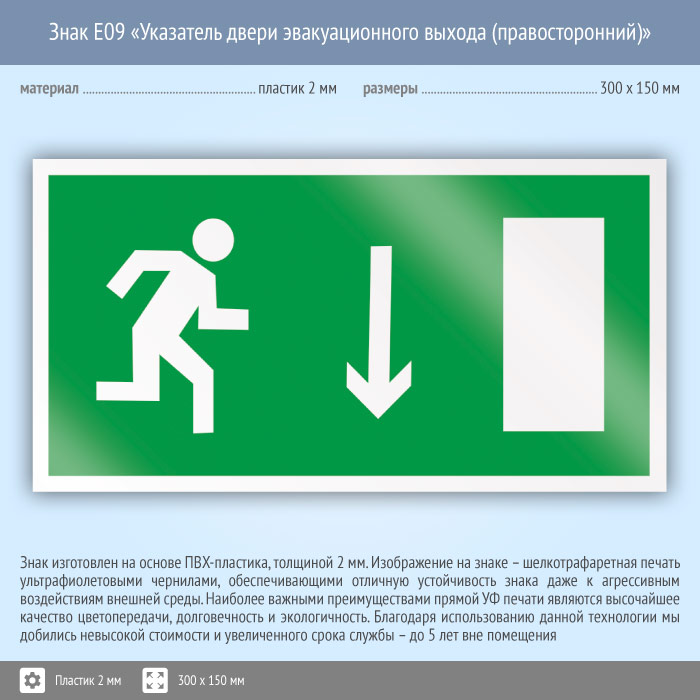 Знак E09 «Указатель двери эвакуационного выхода (правосторонний)» (пластик, 300х150 мм) в Ачинске купить