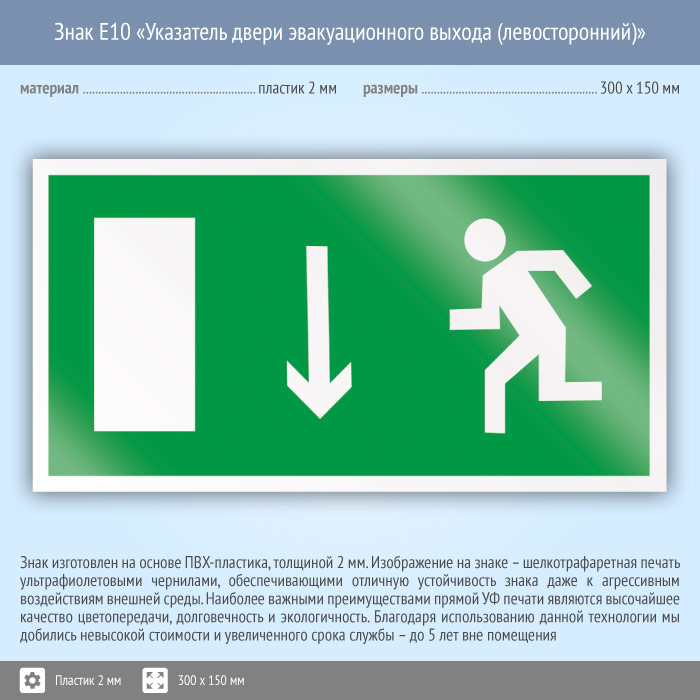 Знак E10 «Указатель двери эвакуационного выхода (левосторонний)» (пластик, 300х150 мм) в Ачинске купить