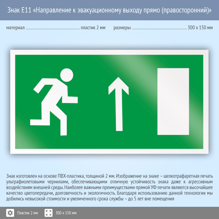 Знак E11 «Направление к эвакуационному выходу прямо (правосторонний)» (пластик, 300х150 мм) в Ачинске купить
