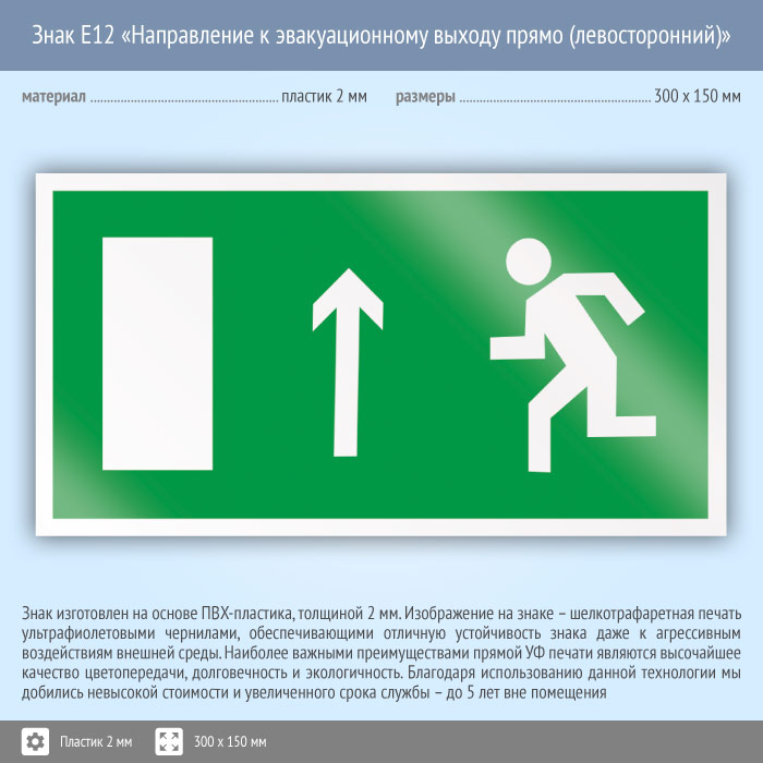 Знак E12 «Направление к эвакуационному выходу прямо (левосторонний)» (пластик, 300х150 мм) в Ачинске купить