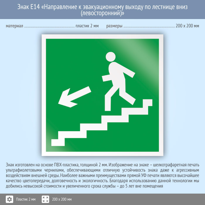 Знак E14 «Направление к эвакуационному выходу по лестнице вниз (левосторонний)» (пластик, 200х200 мм) в Ачинске купить