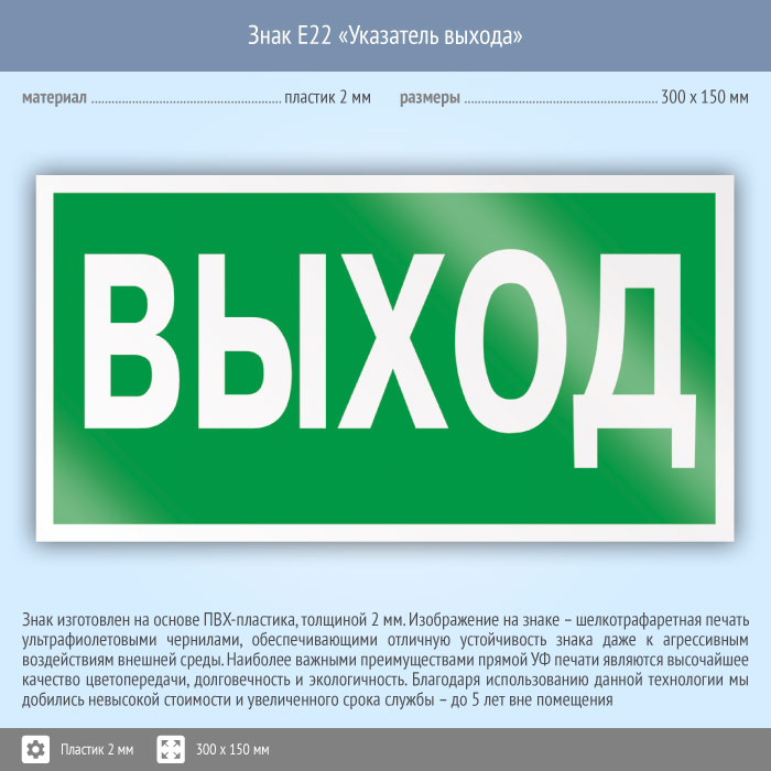 Знак E22 «Указатель выхода» (пластик, 300х150 мм) в Ачинске купить