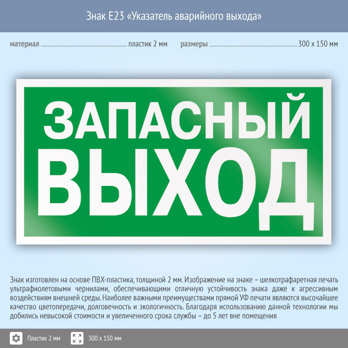 Знак E23 «Указатель запасного выхода» (устаревший) (пластик, 300х150 мм) в Ачинске купить