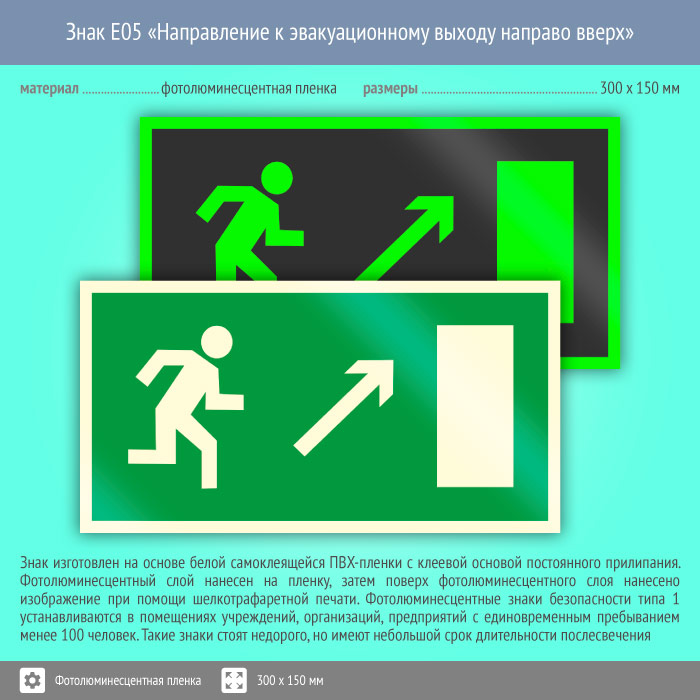 Знак E05 «Направление к эвакуационному выходу направо вверх» (фотолюминесцентная пленка, 300х150 мм) в Ачинске купить