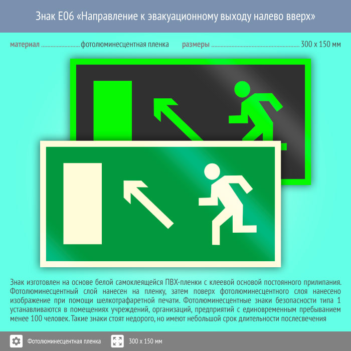 Знак E06 «Направление к эвакуационному выходу налево вверх» (фотолюминесцентная пленка, 300х150 мм) в Ачинске купить
