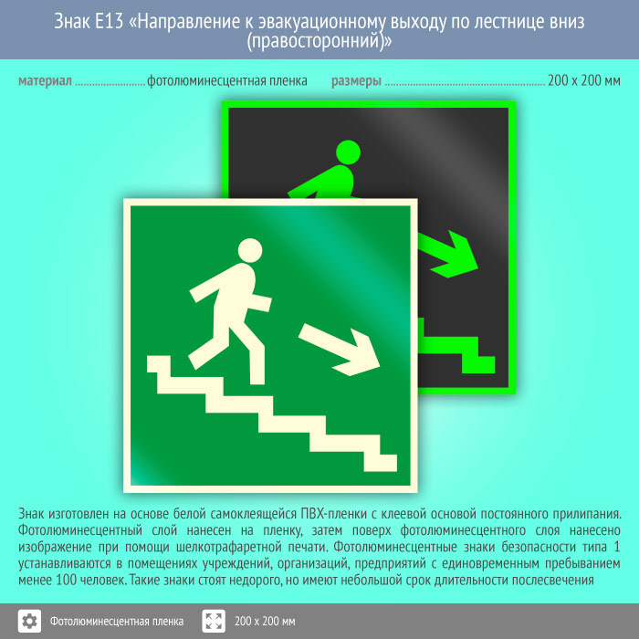 Знак E13 «Направление к эвакуационному выходу по лестнице вниз (правосторонний)» (фотолюминесцентная пленка, 200х200 мм) в Ачинске купить