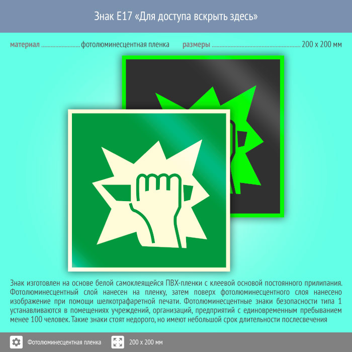 Знак E17 «Для доступа вскрыть здесь» (фотолюминесцентная пленка, 200х200 мм) в Ачинске купить