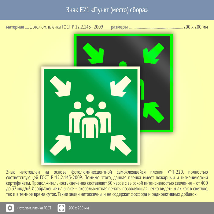 Знак E21 «Пункт (место) сбора» (фотолюминесцентная пленка ГОСТ 34428-2018, 200х200 мм) в Ачинске купить