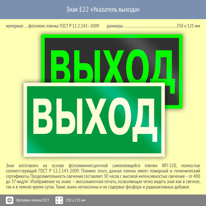 Знак E22 «Указатель выхода» (фотолюминесцентная пленка ГОСТ 34428-2018, 250х125 мм) в Ачинске купить