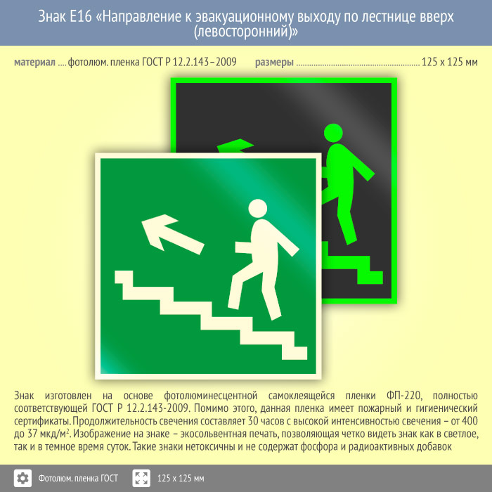 Знак E16 «Направление к эвакуационному выходу по лестнице вверх (левосторонний)» (фотолюминесцентная пленка ГОСТ 34428-2018, 125х125 мм) в Ачинске купить
