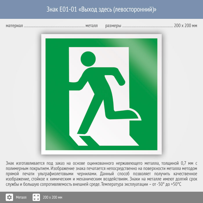 Знак E01-01 «Выход здесь (левосторонний)» (металл, 200х200 мм) в Ачинске купить