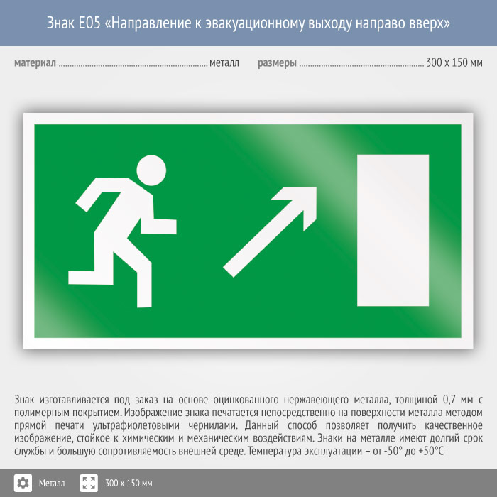 Знак E05 «Направление к эвакуационному выходу направо вверх» (металл, 300х150 мм) в Ачинске купить