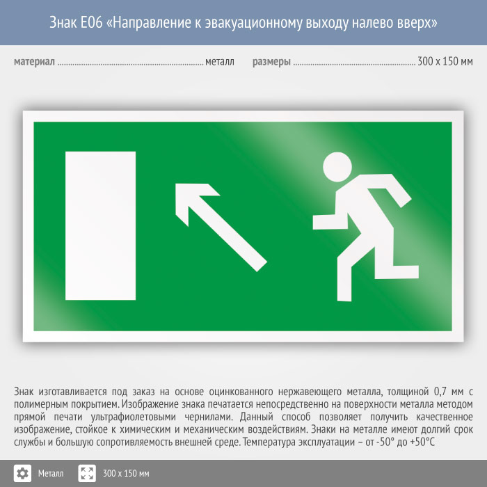 Знак E06 «Направление к эвакуационному выходу налево вверх» (металл, 300х150 мм) в Ачинске купить