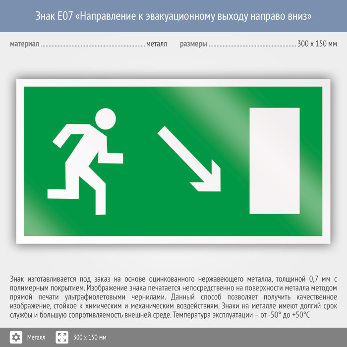 Знак E07 «Направление к эвакуационному выходу направо вниз» (металл, 300х150 мм) в Ачинске купить
