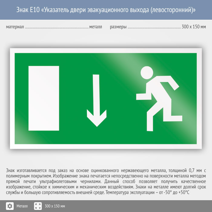 Знак E10 «Указатель двери эвакуационного выхода (левосторонний)» (металл, 300х150 мм) в Ачинске купить