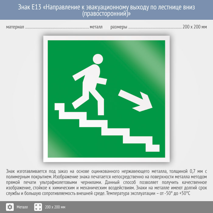 Знак E13 «Направление к эвакуационному выходу по лестнице вниз (правосторонний)» (металл, 200х200 мм) в Ачинске купить