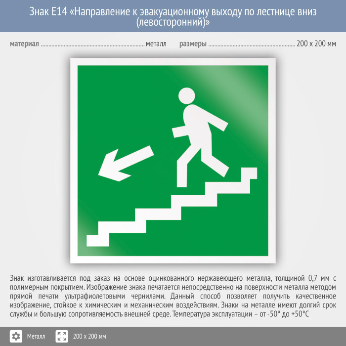Знак E14 «Направление к эвакуационному выходу по лестнице вниз (левосторонний)» (металл, 200х200 мм) в Ачинске купить
