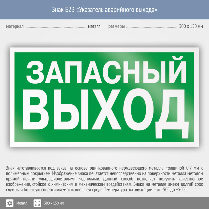 Знак E23 «Указатель запасного выхода» (устаревший) (металл, 300х150 мм) в Ачинске купить