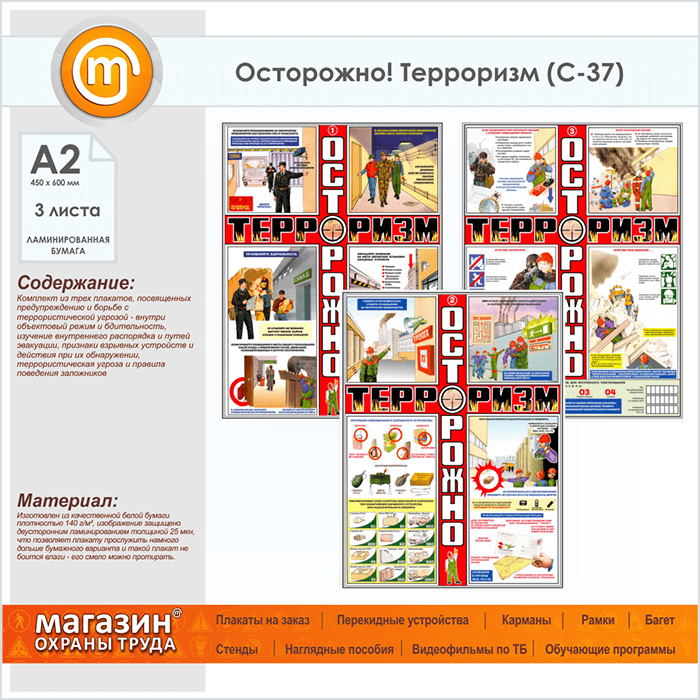 Плакаты «Осторожно! Терроризм» (С-37, ламинированная бумага, А2, 3 листа) в Ачинске купить