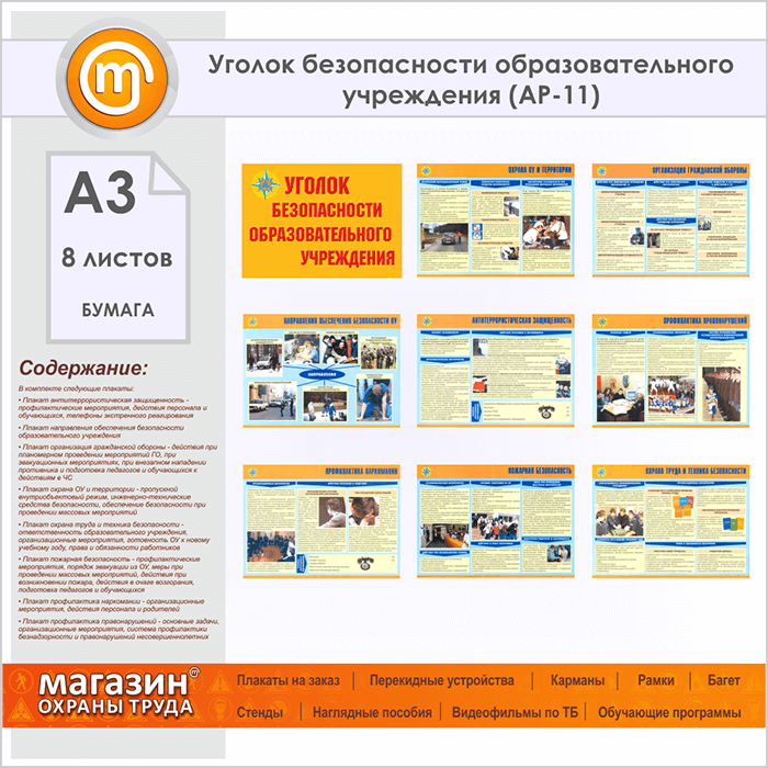 Плакаты «Уголок безопасности образовательного учреждения» (АР-11, бумага, А3, 8 листов) в Ачинске купить