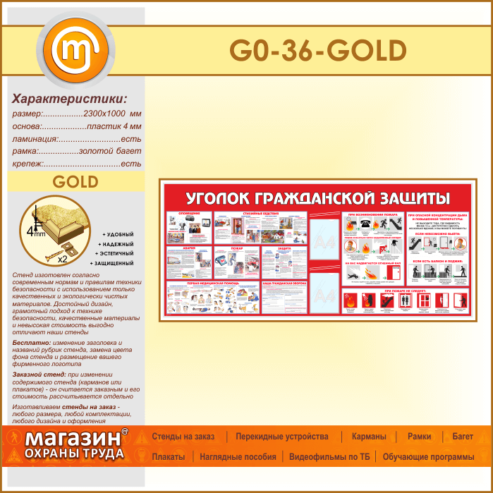 Стенд «Уголок гражданской защиты» c 2 карманами (GO-36-GOLD) в Ачинске купить