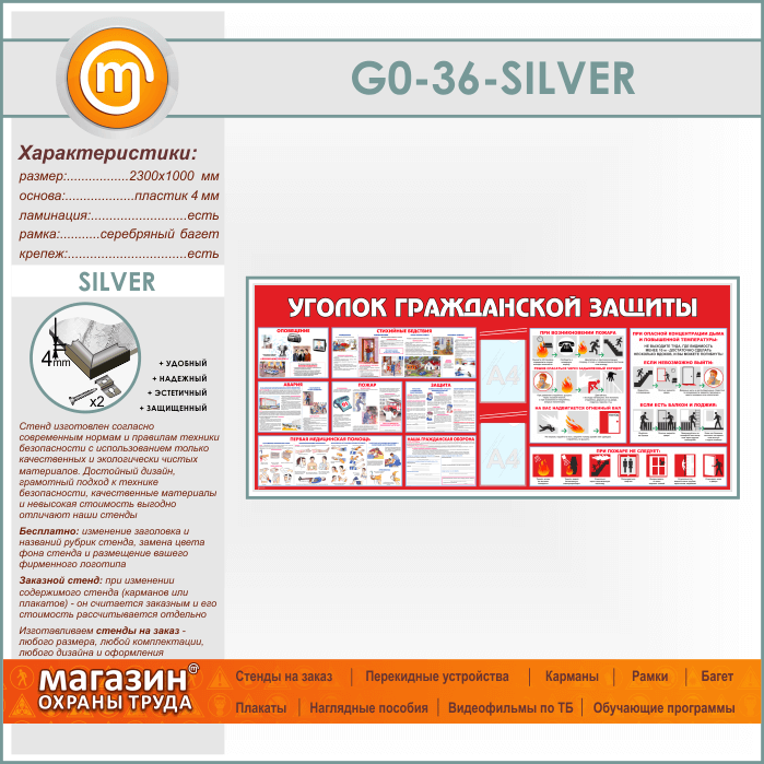 Стенд «Уголок гражданской защиты» c 2 карманами (GO-36-SILVER) в Ачинске купить