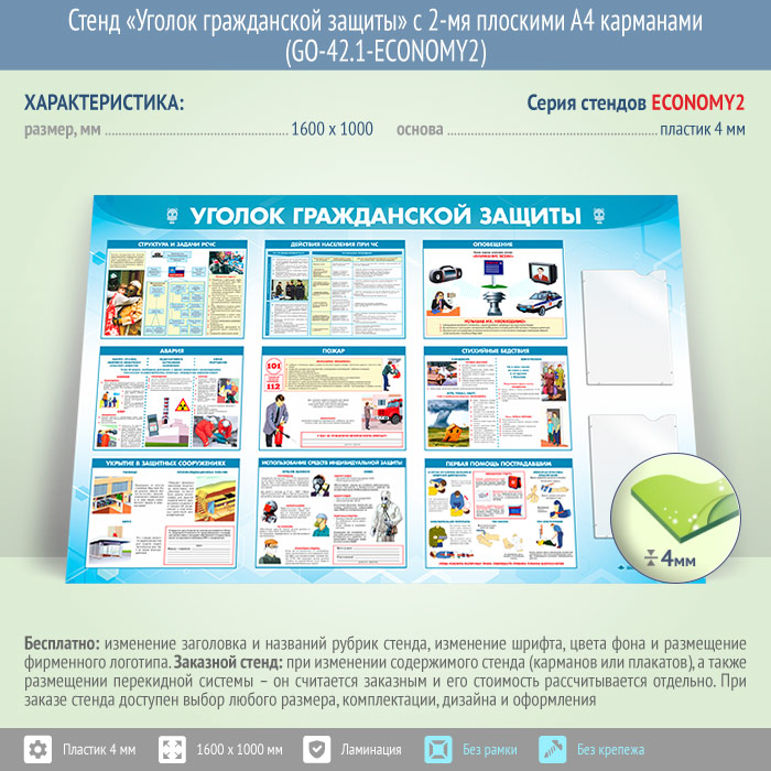 Стенд «Уголок гражданской защиты» с 2-мя плоскими А4 карманами (GO-42.1-ECONOMY2) в Ачинске купить