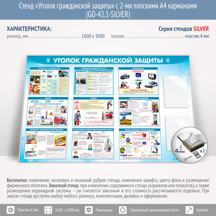 Стенд «Уголок гражданской защиты» с 2-мя плоскими А4 карманами (GO-42.1-SILVER) в Ачинске купить