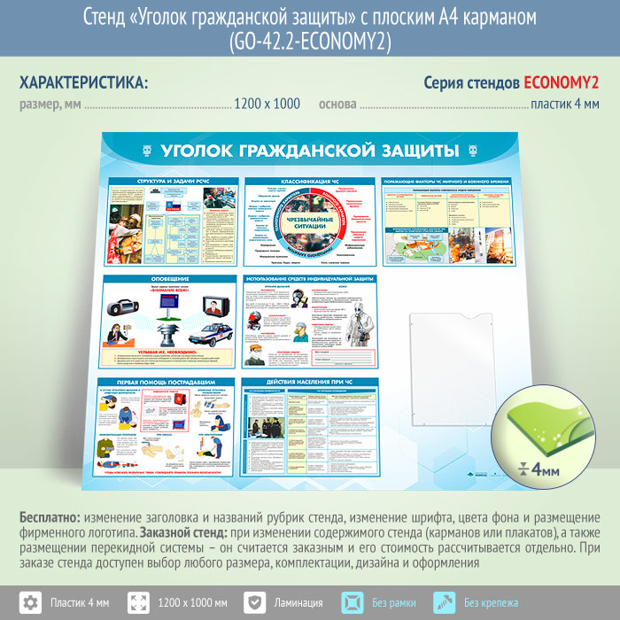 Стенд «Уголок гражданской защиты» с плоским А4 карманом (GO-42.2-ECONOMY2) в Ачинске купить