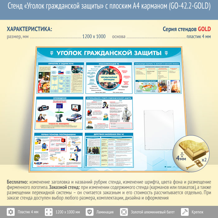 Стенд «Уголок гражданской защиты» с плоским А4 карманом (GO-42.2-GOLD) в Ачинске купить