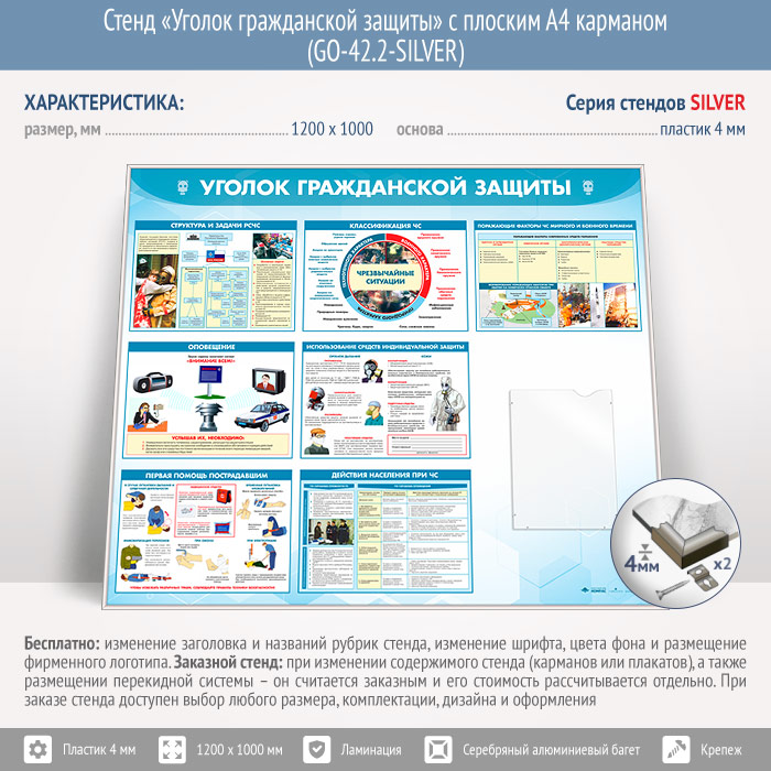 Стенд «Уголок гражданской защиты» с плоским А4 карманом (GO-42.2-SILVER) в Ачинске купить