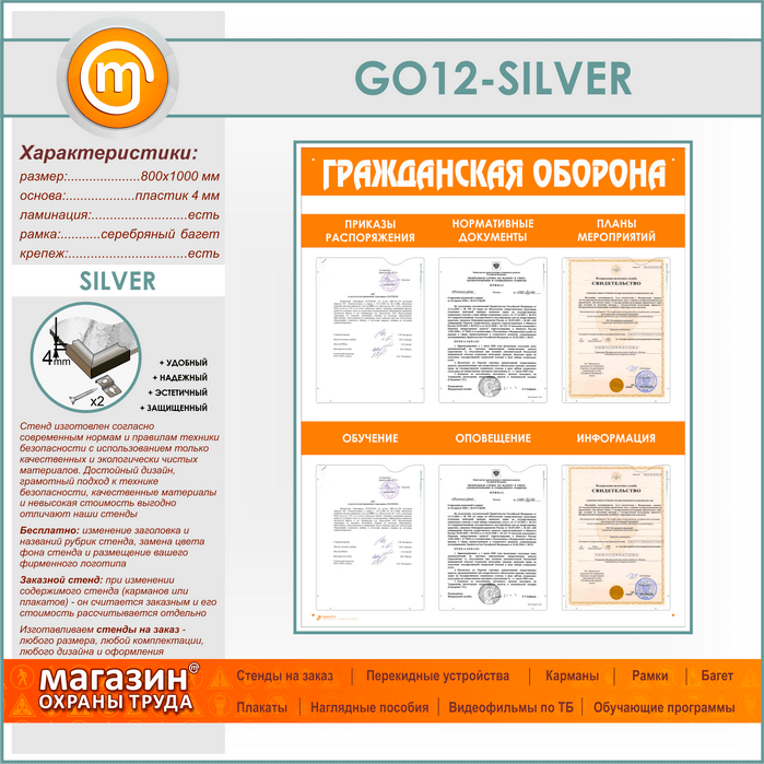 Стенд «Гражданская оборона» с 6 плоскими карманами (GO-12-SILVER) в Ачинске купить