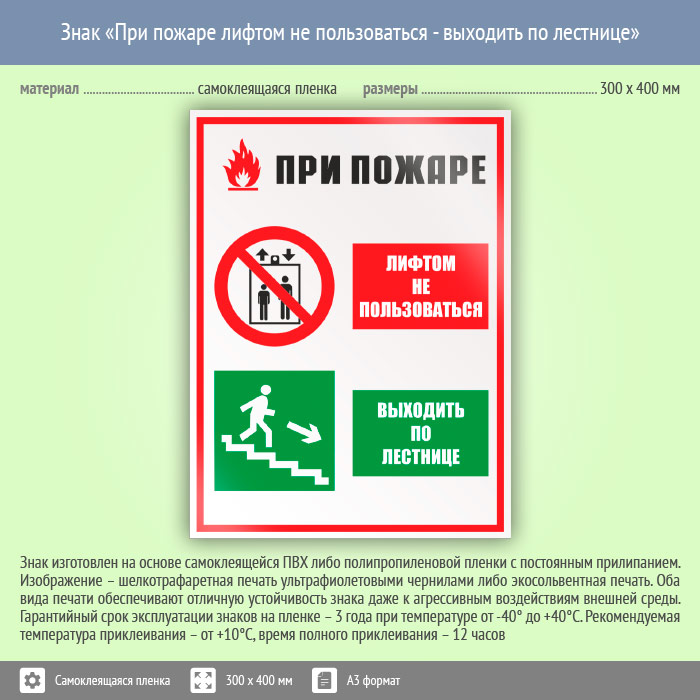 Знак «При пожаре лифтом не пользоваться - выходить по лестнице», КЗ-73 (пленка, 300х400 мм) в Ачинске купить