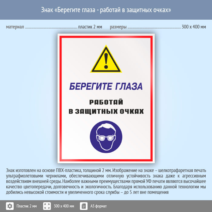 Знак «Берегите глаза - работай в защитных очках», КЗ-04 (пластик, 300х400 мм) в Ачинске купить