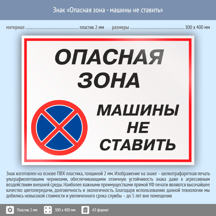 Знак «Опасная зона - машины не ставить», КЗ-32 (пластик, 400х300 мм) в Ачинске купить