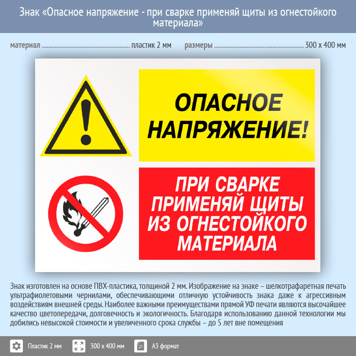Знак «Опасное напряжение - при сварке применяй щиты из огнестойкого материала», КЗ-46 (пластик, 400х300 мм) в Ачинске купить