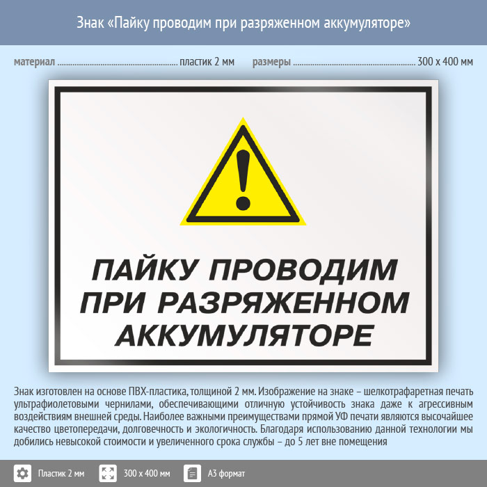 Знак «Пайку проводим при разряженном аккумуляторе», КЗ-62 (пластик, 400х300 мм) в Ачинске купить