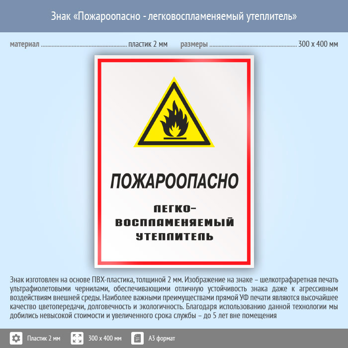 Знак «Пожароопасно - легковоспламеняемый утеплитель», КЗ-68 (пластик, 300х400 мм) в Ачинске купить