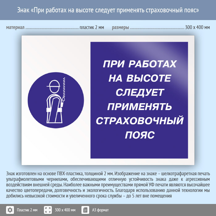 Знак «При работах на высоте следует применять страховочный пояс», КЗ-75 (пластик, 400х300 мм) в Ачинске купить