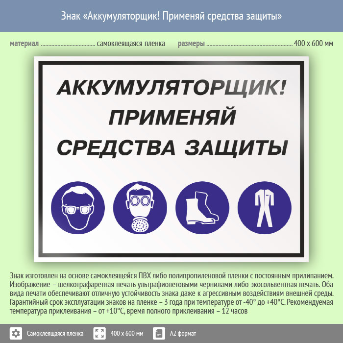 Знак «Аккумуляторщик! Применяй средства защиты», КЗ-02 (пленка, 600х400 мм) в Ачинске купить