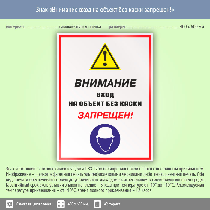 Знак «Внимание вход на объект без каски запрещен!», КЗ-13 (пленка, 400х600 мм) в Ачинске купить