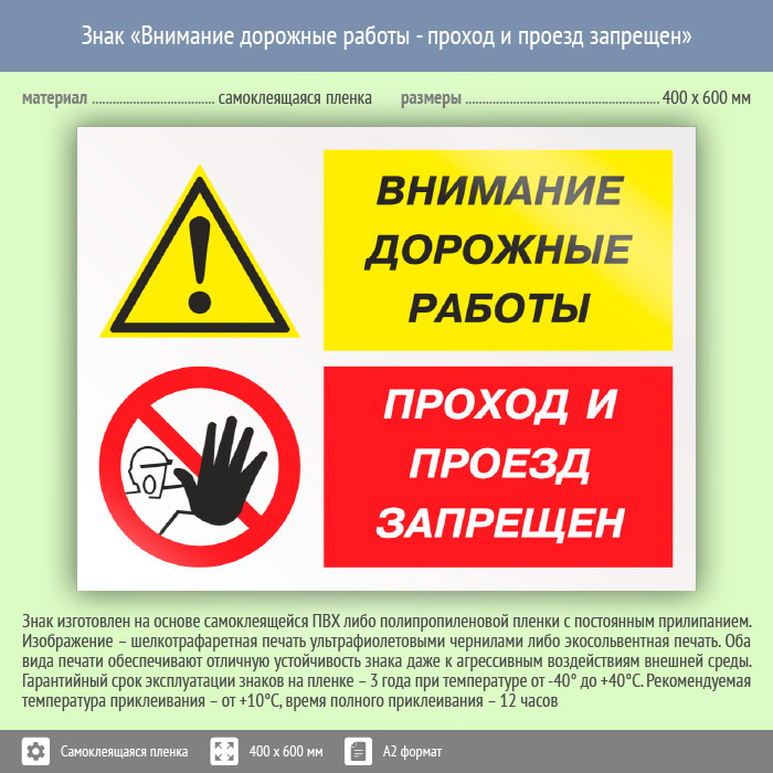 Знак «Внимание дорожные работы - проход и проезд запрещен», КЗ-14 (пленка, 600х400 мм) в Ачинске купить