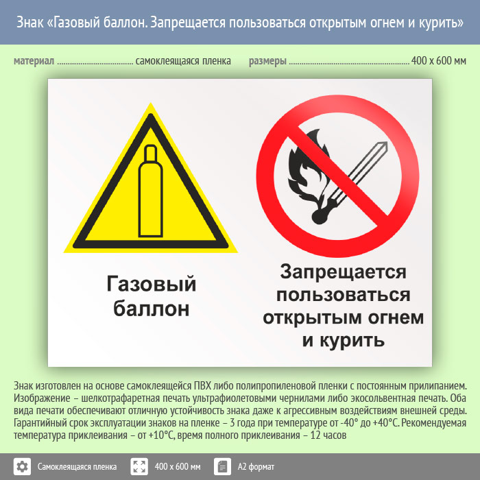 Знак «Газовый баллон. Запрещается пользоваться открытым огнем и курить», КЗ-19 (пленка, 600х400 мм) в Ачинске купить